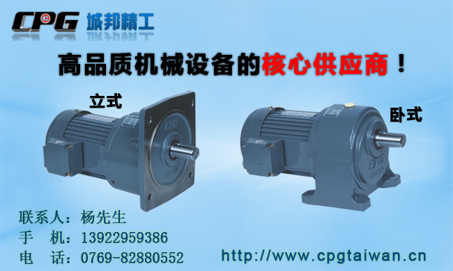 因CPG減速電機質量上乘穩定、價格優惠,在國內市場受到廣大客戶積極的認可和支持,繼而臺灣城邦工廠在蘇州建立第二家減速電機工廠,并國內統一注冊名為晟邦精工,商標仍為臺灣統一商標“CPG”,按照本產品類型分類為:CPG齒輪減速機,CPG減速電機,或晟邦剎車馬達,晟邦剎車電機,減速馬達,晟邦電機.