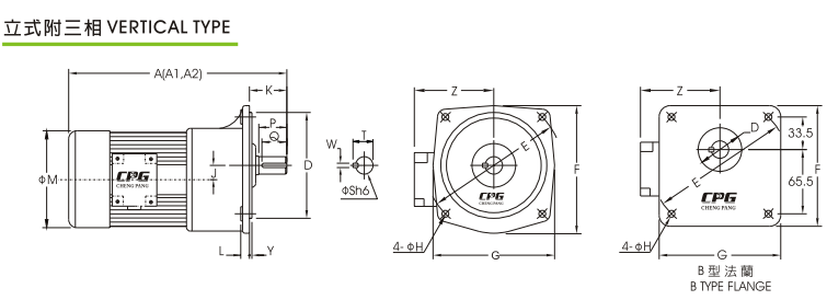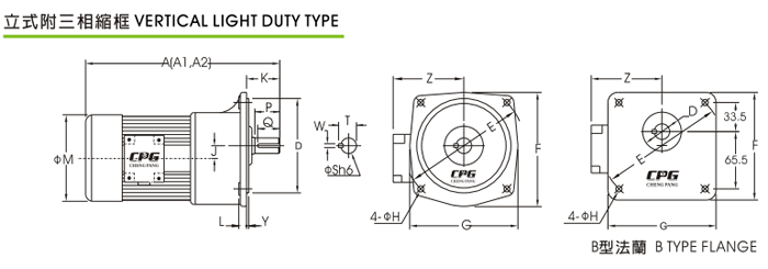 (二)下圖為縮框輕載型CV..S(B)立式附三相(剎車)齒輪減速馬達(dá)詳細(xì)參數(shù)及選型參數(shù):